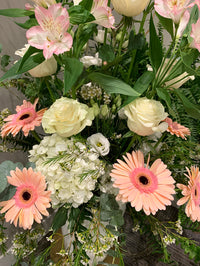 - Exceptionnel (tel qu'illustré) : ce format inclut 4 bouquets de fleurs, soit 1 bouquet d'alstroemerias, 2 bouquets de roses et de pivoines et 1 bouquets de fleurs mixtes. Inclut également un trio de bougies flottantes et 2 gros arrangements (un de chaque côté).