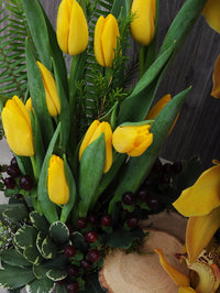 Nous vous présentons ici un bouquet de fleurs pour un hommage coloré et rayonnant. Cet arrangement composé de fleurs d’orchidées et de tulipes est un choix parfait pour célébrer la vie. Accompagné de verdure et d’éléments de bois, il apportera réconfort et douceur!