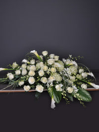 Majestueux arrangement tout en douceur composé principalement de roses, d'hydrangées blancs et de callas souvenirs (artificiels), qui peuvent être conserver en mémoire du défunt.