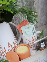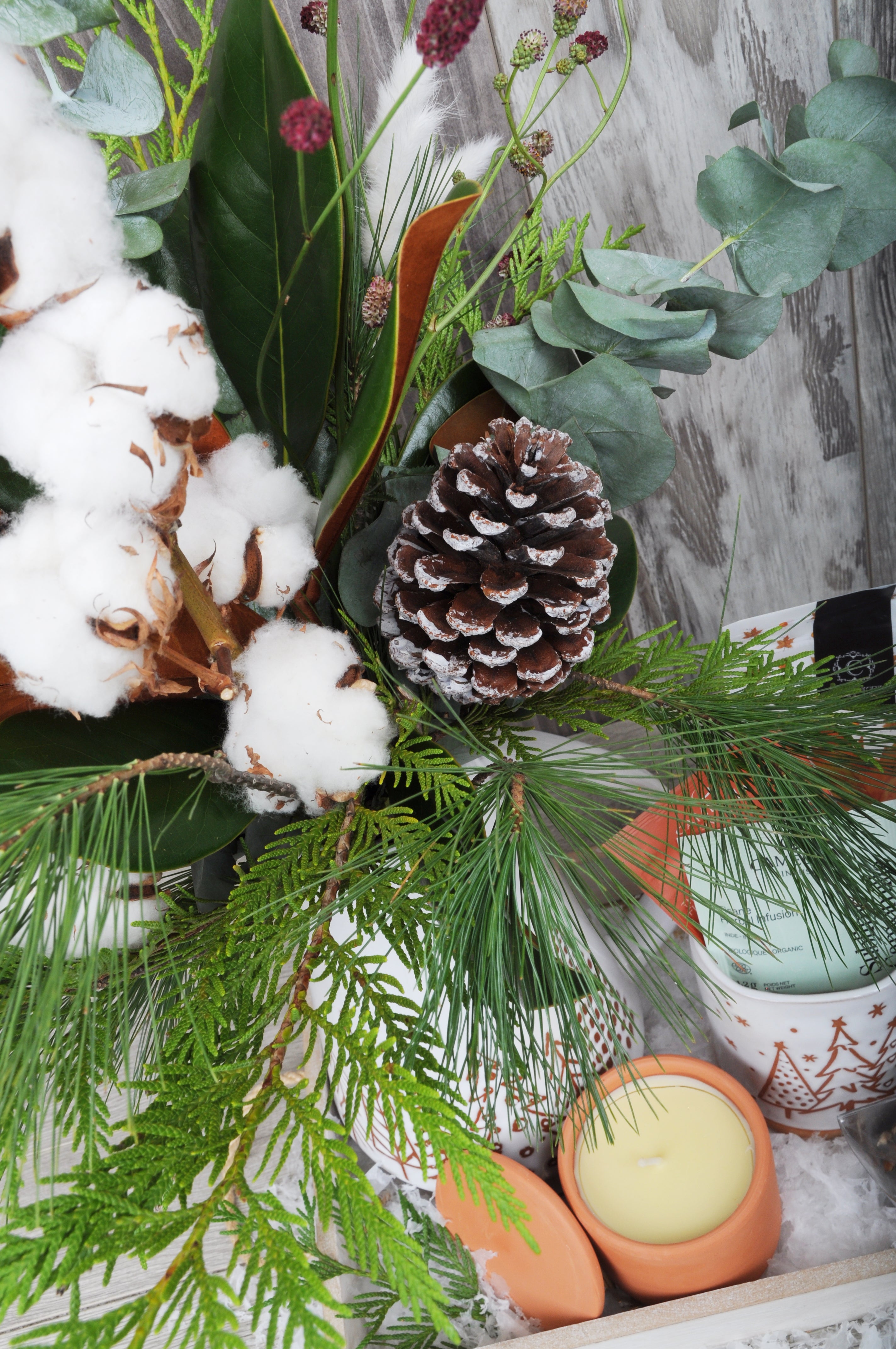 Ce panier cadeau pichet et bouquet de fleurs champêtre a tout pour plaire. Tout d'abord, il inclut un très joli bouquet signé À la Boîte à Fleurs composé de branches de coton, feuilles de magnolia, branches d'eucalyptus et de sapinage. Choisir d’offrir un bouquet de fleurs pour Noël est une attention des plus délicates et qui touchera droit au cœur! Les fleurs ont ce petit quelque chose qui réchauffe le cœur et qui apporte une douceur réconfortante.