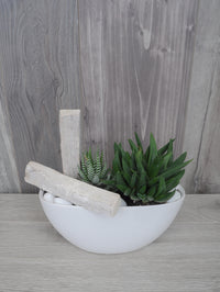 Duo de plantes succulentes naturelles en parfaite harmonie présentée dans un vase blanc ou noir mat (au choix) et accompagnée de branches de bois, pour un look des plus naturels.
