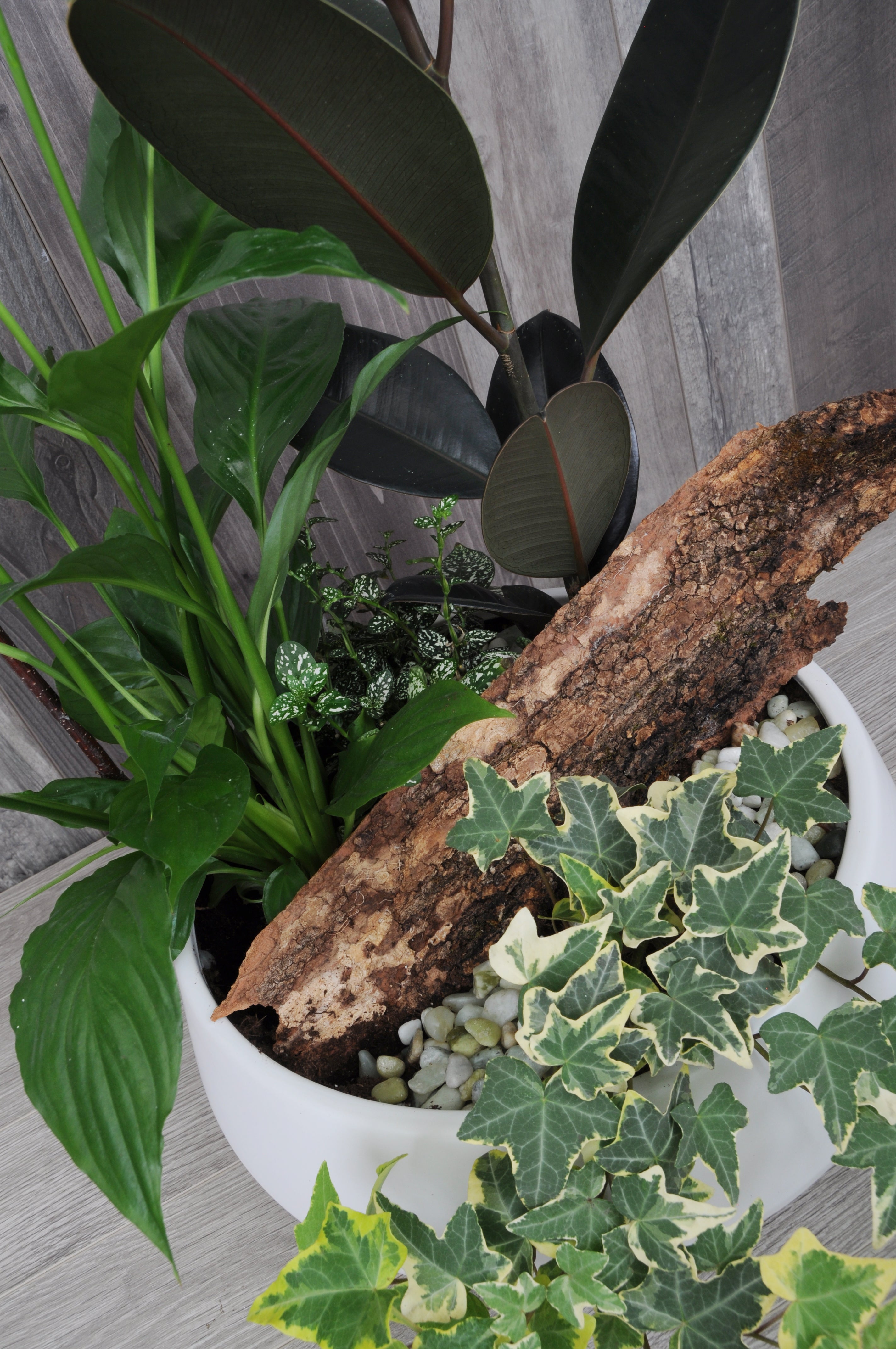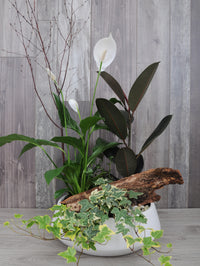 Ce superbe arrangement tropical est présenté dans un vase en céramique blanc mat et accompagné de morceau de bois. Un charme fou!