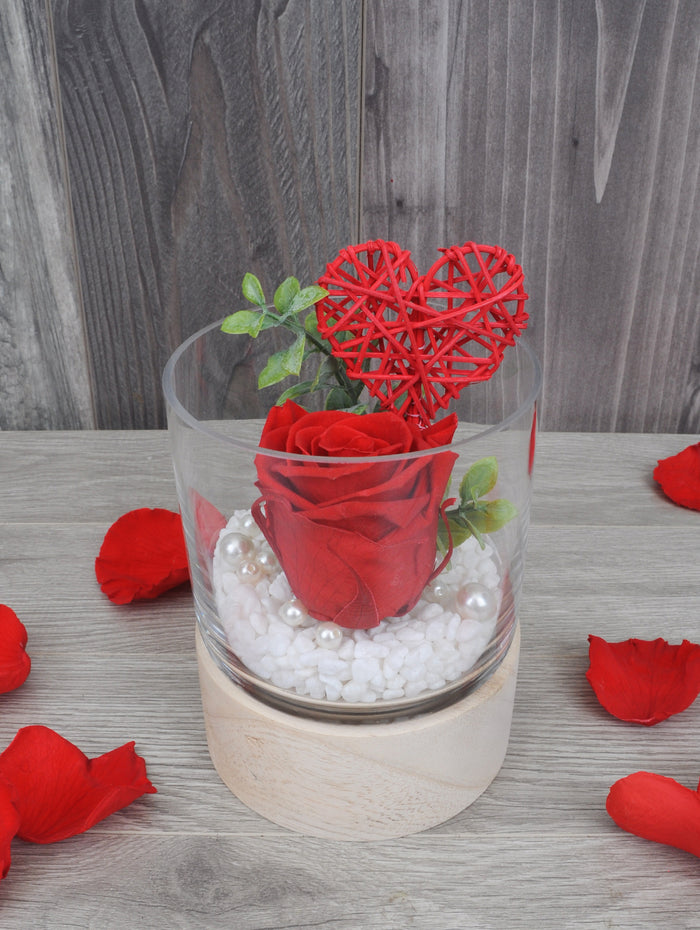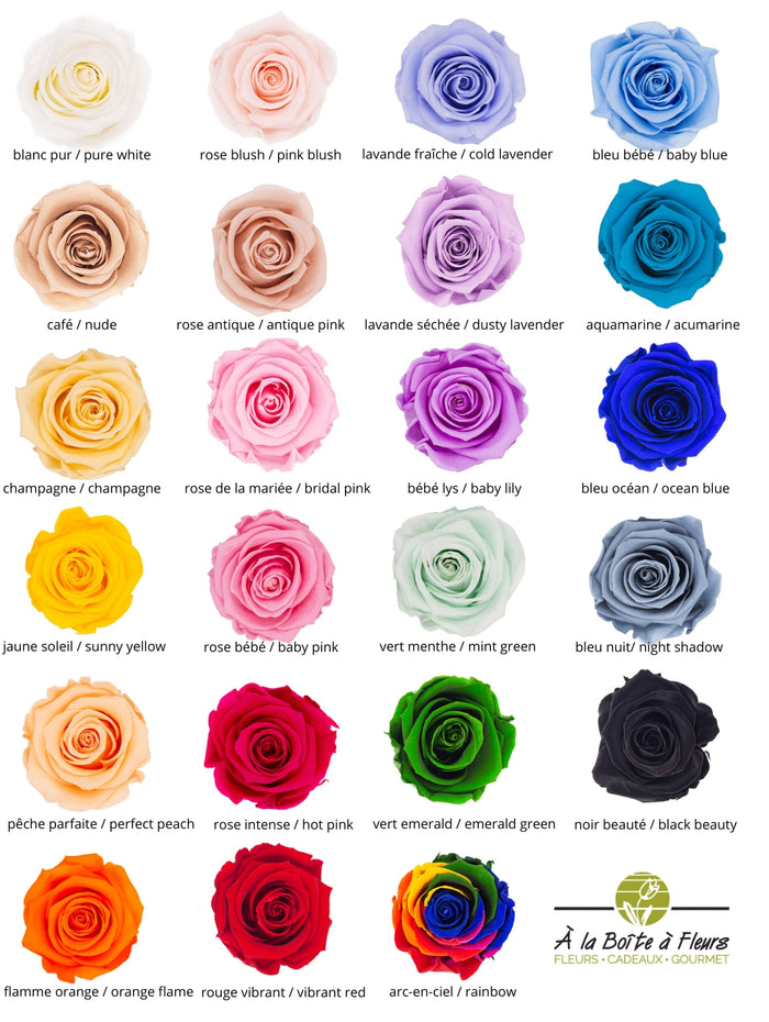 Découvrez la splendeur des magnifiques roses éternelles. Offertes en différentes couleurs (blanche, rouge, rose, bleue...) et en de multiples arrangements possibles, les roses éternelles sont parfaites à offrir pour exprimer amour & affection sincère ou un soutien spontané. Il s'agit d'une rose naturelle déshydratée et réhydratée par un liquide de conservation. Elle garde l'aspect d'une rose naturelle et a une durée de vie de 5 ans. Très facile d'entretien. Découvrez-les! Livraison possible partout au Canada.
