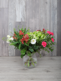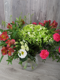 Bouquet de fleurs dans les teintes de fuchsia, blanc et vert, fait de lisianthus, d’alstromérias, mini-oeillets et d’hydrangées, accompagné de feuillage agencé avec soin, et le tout positionné dans un vase de verre. Hauteur totale approximative de 20’’.