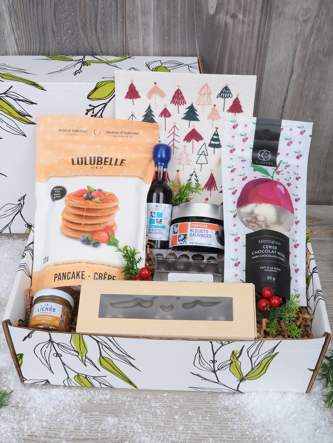 Boîte cadeau joliment décorée pour le temps des fêtes et garnie de produits québécois créés par nos artisans locaux que vous adorerez!