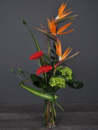 Bouquet de fleurs dans les teintes d’orange, rouge et vert, fait de gerberas, d’oiseaux du paradis et d’hydrangées, accompagné de feuillage exotique agencé avec soin et présenté dans un vase de verre. Hauteur totale approximative de 30’’.