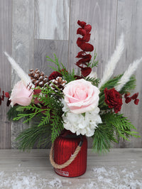 Ce bouquet de table qui fera un magnifique centre de table pour le temps des fêtes est composé de roses, eucalyptus, pampas, hydrangées et de cônes de pin. Son vase rouge festif avec anse ajoute ce je-ne-sais-quoi qui charmera à coup sûr!