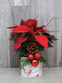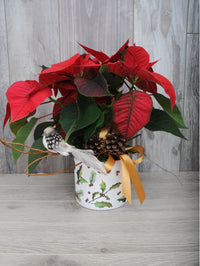 Avec son joli cache-pot aux motifs hivernaux, ce poinsettia vous est présenté avec de fines branches de bois, un délicat sapinage et des boules de Noël. Son look est féerique!