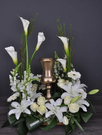 Arrangement of delicate and refined urn in white and green colors, made of callas, lilies, roses, snapdragons and gerberas, carefully accompanied with foliage. Total approximate height of 30" and width of 24".