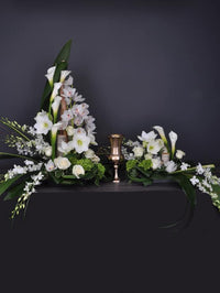 Arrangement in the shades of white and green in which the roses, hydrangea and souvenir callas (artificial), which can be kept in memory of the deceased, fit perfectly together.