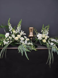 Arrangement of delicate and refined urn in white and green colors, made of lilies, roses, snapdragons, gerberas and dendrobiums, carefully accompanied with foliage. Total approximate height of 20" and width of 60".