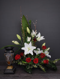 Beautiful arrangement which is composed of red roses and white lilies, and accompanied by greenery.