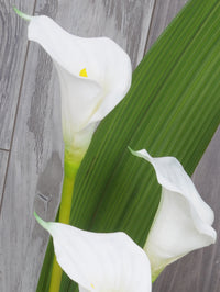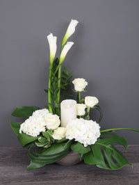 A tall arrangement in shades of white and green, featuring roses, callas (natural or artificial) and hydrangea. A battery-operated candle is included for a soothing moment of contemplation.