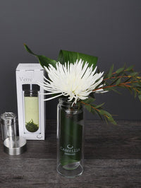 Pretty flower Anastasia presented in a bottle made of double walled glass with an airtight lid and a removable stainless steel filter from Camellia Sinensis. Designed for people who like to drink tea while being active!