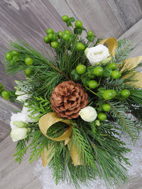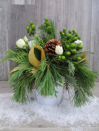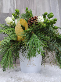 A simple centerpiece of lisianthus, pine cones, hypericum, fir branches and ribbon in a pretty 4" diameter white and gold cachepot.