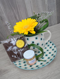 Offer this pretty bouquet of natural gerbera & limonium (caspia) presented in a ceramic cup and its plate. The person will then be able to use the cup and the plate to enjoy tea, coffee or herbal tea.
