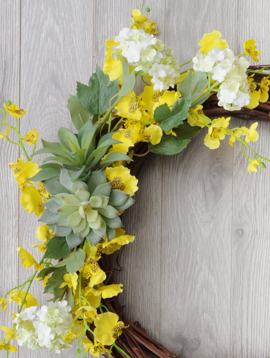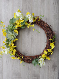 Made from artificial flowers on a natural vine crown, this crown is more than just pretty : it is lovely, and brings a touch of cheer and brightness to any room or front door!