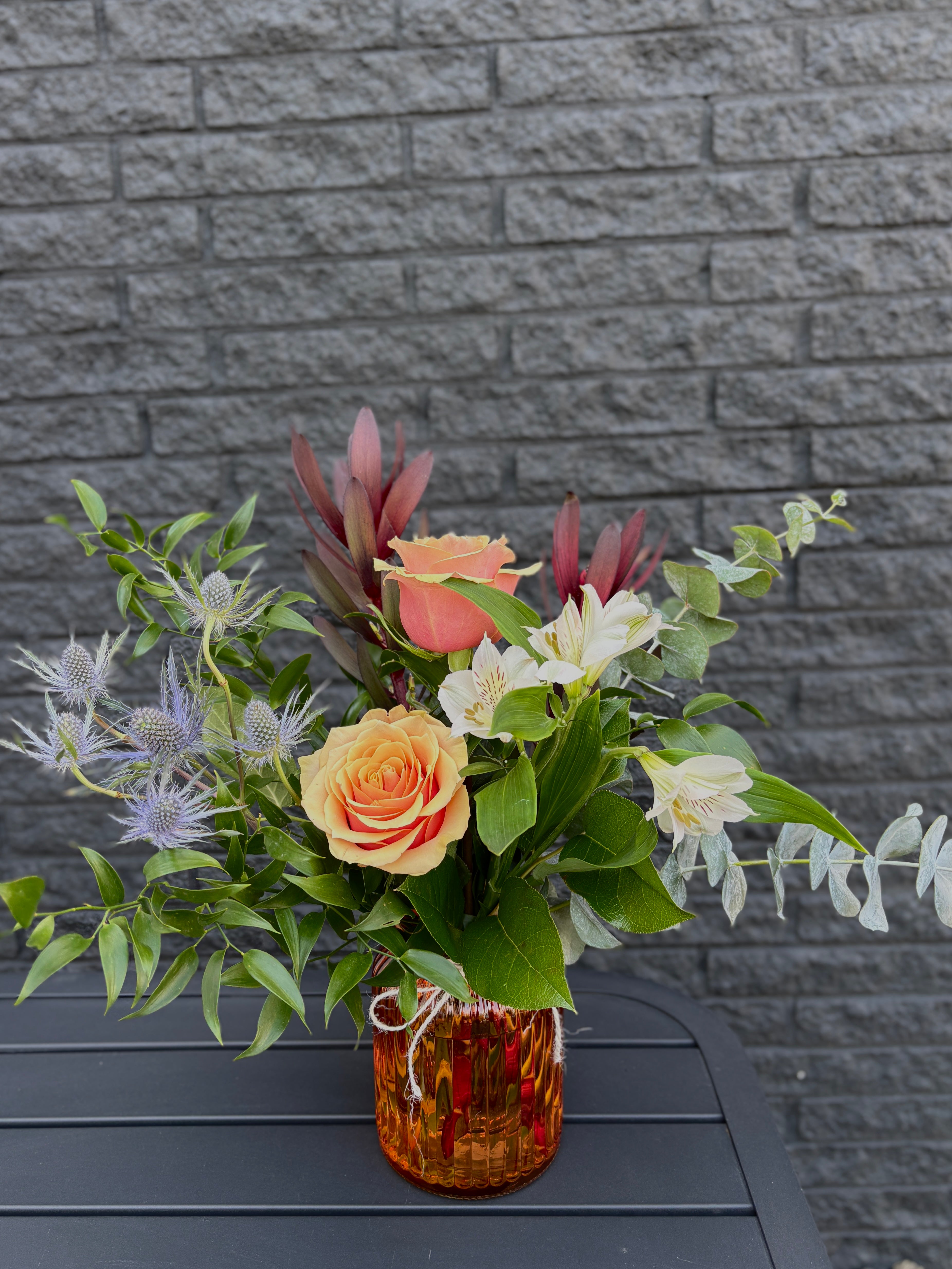 The bouquet is composed of eryngium, leucadendron, roses, alstroemerias and eucalyptus. A delicate greenery is added. For optimum result, add a pretty colorful vase as offered in option.