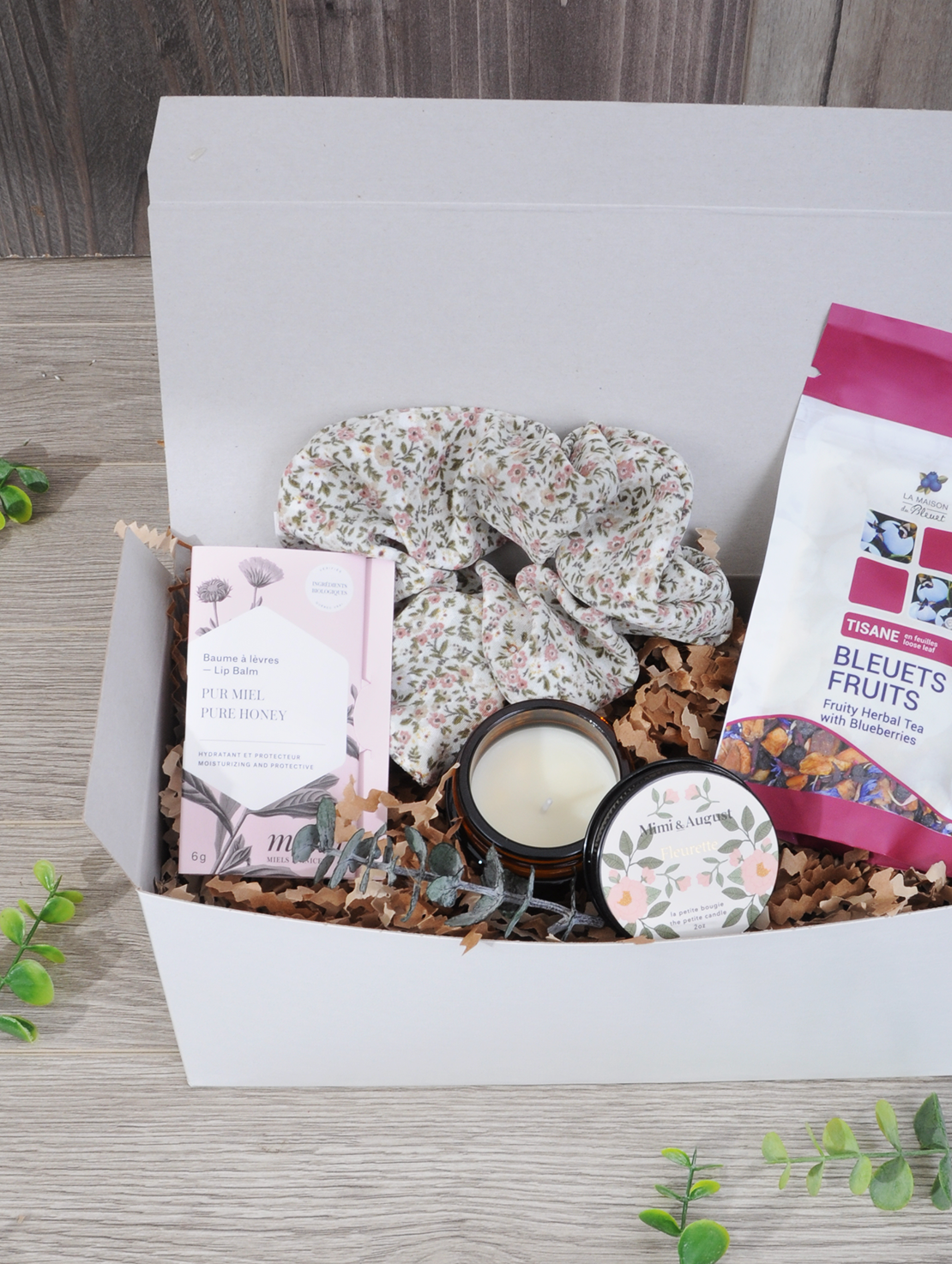 • And as an option, add a Fleurette candle from Mimi and August. Inspired by the magic of nature, imagine yourself strolling through a field of wildflowers in a picturesque countryside, where every step awakens a new fragrance.