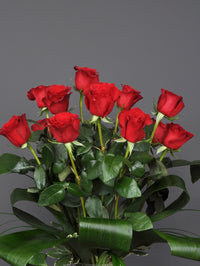 Dozen of red roses accompanied by a nice variety of foliage, all beautifully presented in a glass vase. Total approximate height : 24"