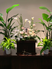 This delicate urn arrangement is a real treat for the soul. Composed of artificial calla and lilies, gerberas, roses, hydrangeas and foliage, it is a peaceful arrangement. The way the flowers are arranged gives the impression of enveloping the urn in softness.