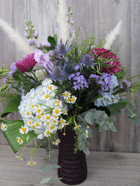 It is made up of hydrangeas, camomile, statice, eryngium, chrysanthemums, eucalyptus, thlaspi, pampas and other country flowers in shades of purple and lilac.