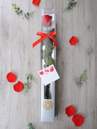 Here is a magnificent preserved rose on a stem ready to offer; presented in a pretty box decorated with a ribbon and accompanied by a wish card! It is a rehydrated natural rose that lasts and retains its beauty for up to 5 years.