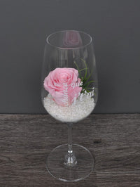 Arrangement composed of a preserved rose & greenery presented in a wine glass from the Quebec company Garçon de table with the writing "Une chance que j't'ai". Choose to add fine chocolates to your gift for extra sweetness!
