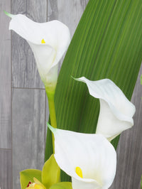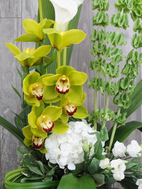 Arrangement funéraire dans les teintes de blanc et de vert joliment composé de callas (naturels ou artificiels), de mollucellas, d'hydrangé, d'une tige de cymbidium, de lisianthus et accompagné de verdures.